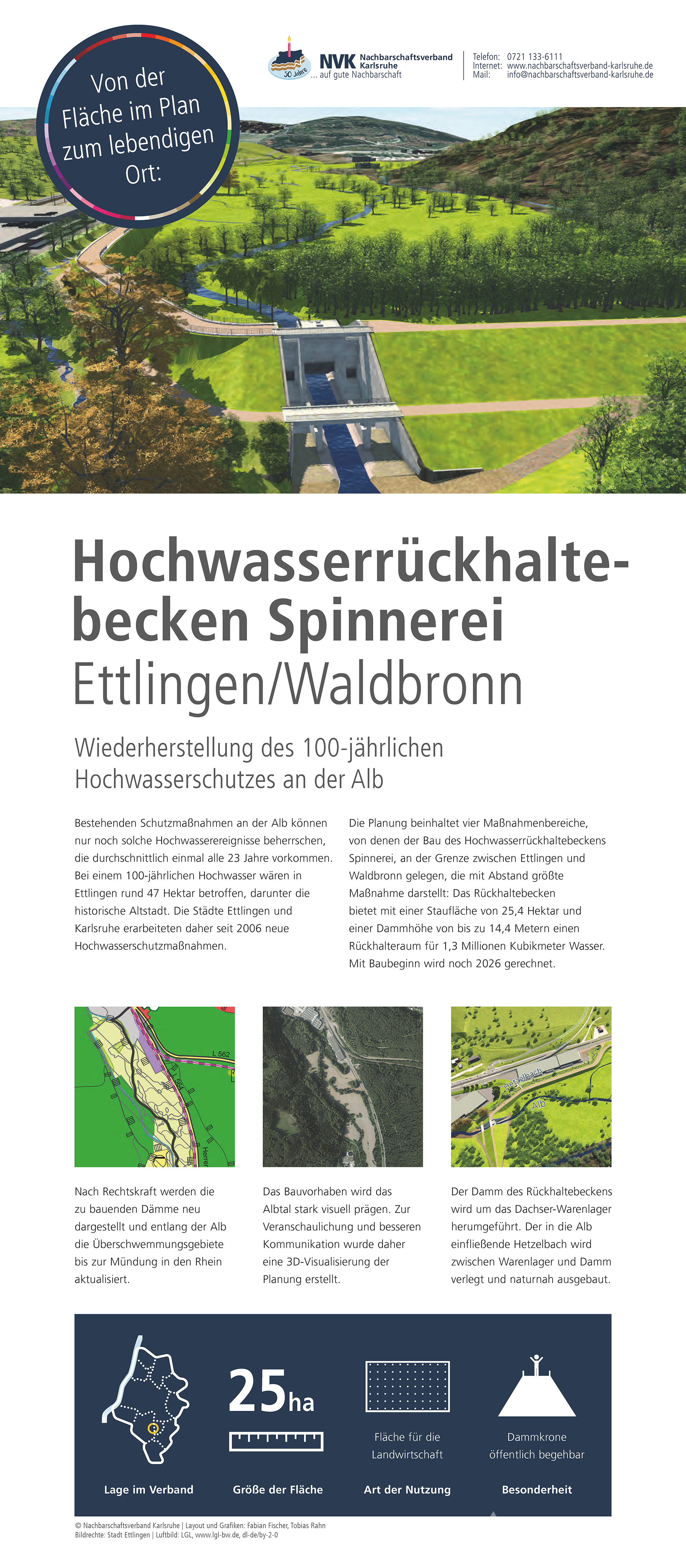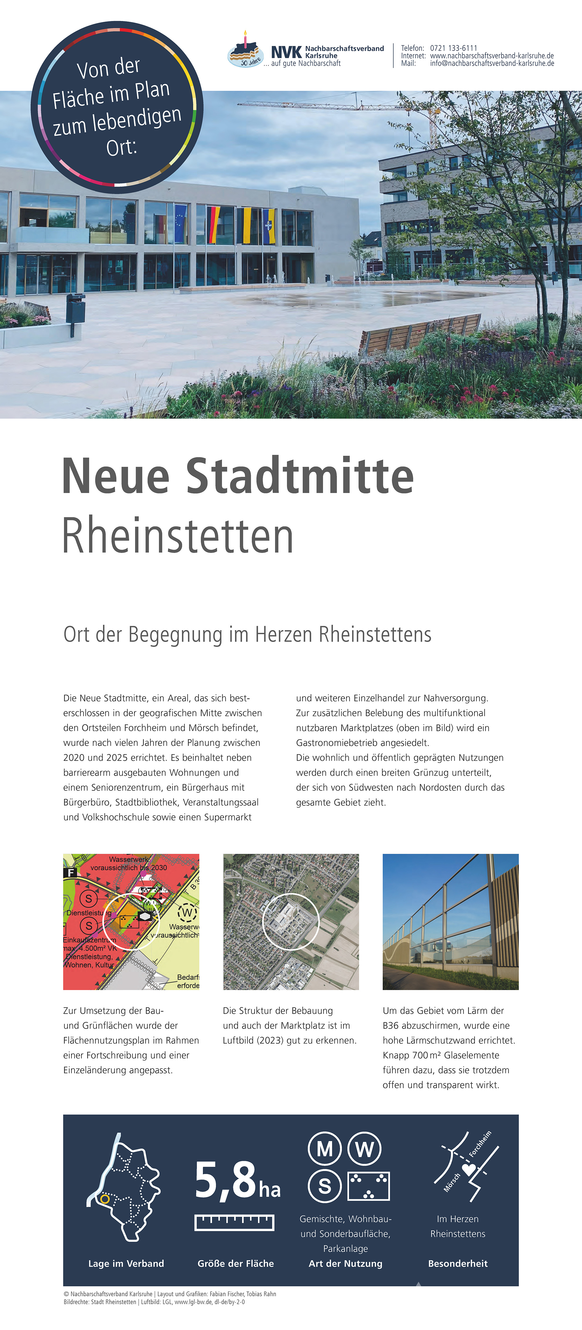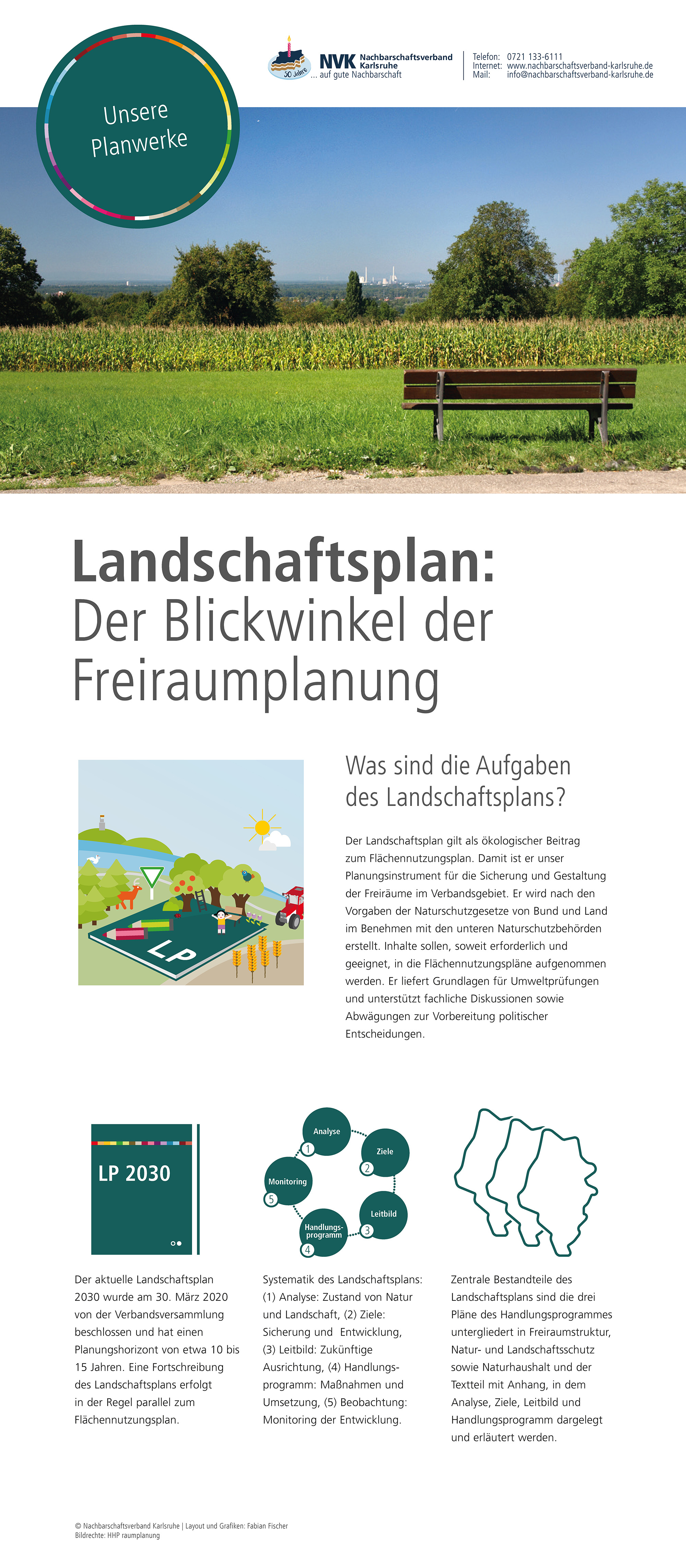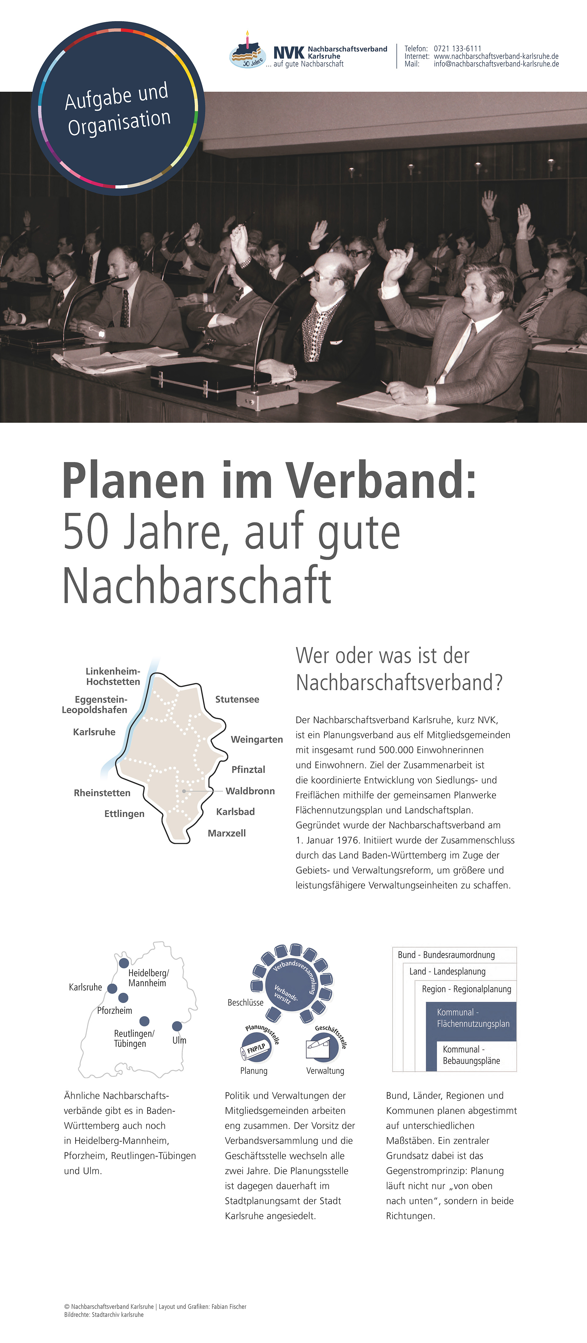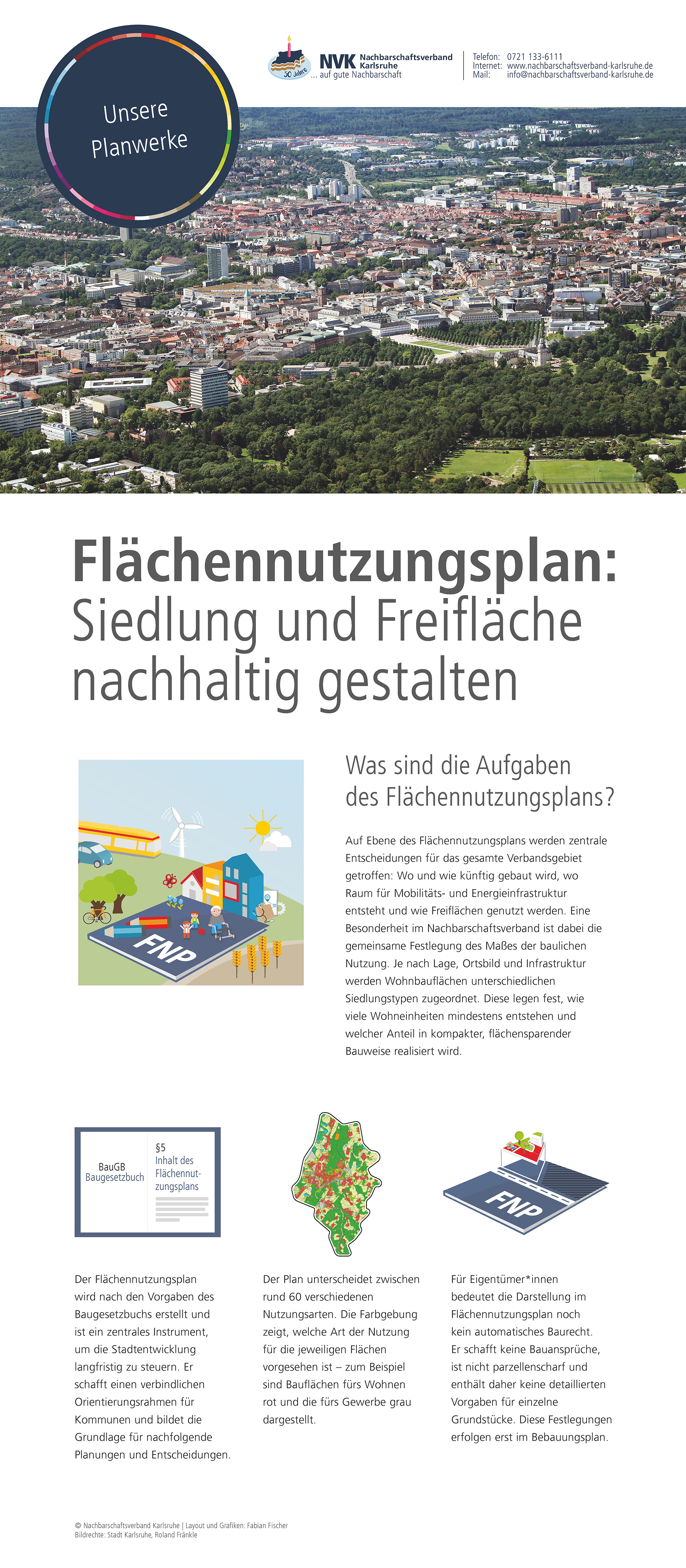 Im Jubiläumsjahr zeigt der Nachbarschaftsverband Karlsruhe eine Ausstellung zur Arbeit des Verbandes, zur Flächennutzungs- und Landschaftsplanung sowie zu ausgewählten Projekten aus den Mitgliedskommunen. Hier sind die Plakate, die auch bei den Jubiläumsveranstaltungen präsentiert werden zu finden.